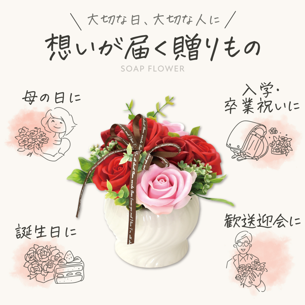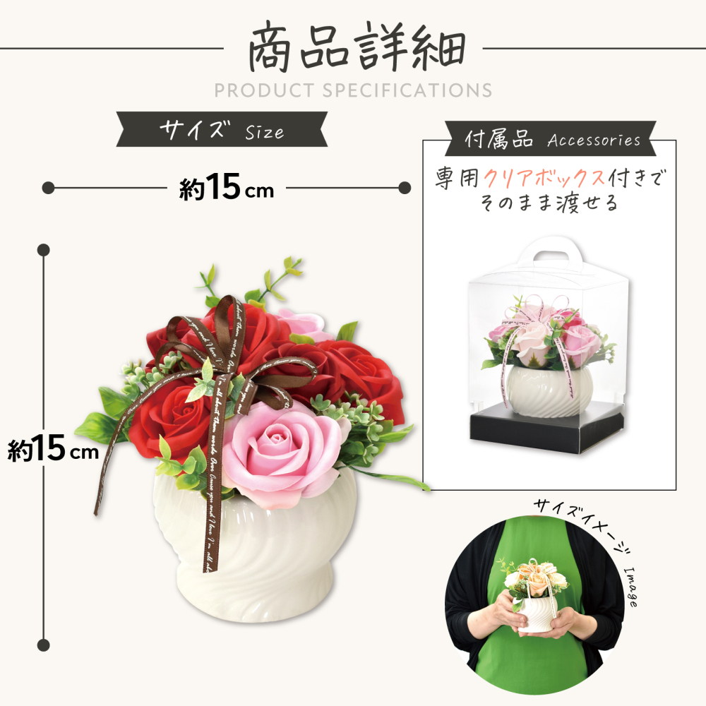 1ケース以上もしくは卸価格合計2万円以上購入で送料無料 こちらの商品は1ケース12個入りです。 ●シャボンフラワーにつきまして以下の点にご注意・ご了承ください。  ・実際の商品と画像の色合い・パーツなどの配置、イメージ等、異なることがございます。  ・予告なく箱の色、ラッピングの仕様が変わることがあります。  ・石けん素材の為、若干の破れ・キズ等がある場合がございます。 ●シャボンフラワーとは?  ・花びらが石鹸でできています。  ・ほのかに石鹸の香りがただよいます。  ・水やり・お手入れ不要!  ・生花が置けない場所でもOKです。 ●注意事項  ・高温多湿、特に水の有る所に置くことは避けて下さい。  ・食べ物ではありません。口に入れないようにして下さい  ・石鹸で出来ていますが、洗濯・洗顔を目的とした物ではない為、洗濯・洗顔に使用しないで下さい。  ・直射日光・蛍光灯を直に当てると色あせ・変色する可能性があります。  ・だんだんと変色(若干の色抜け)はしますが、負荷を掛けない限り花びらが崩れたりする事は稀です。