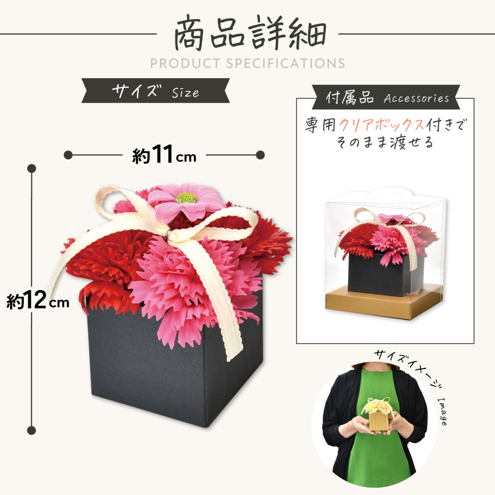 1ケース以上もしくは卸価格合計2万円以上購入で送料無料 こちらの商品は1ケース30個入りです。 ●シャボンフラワーにつきまして以下の点にご注意・ご了承ください。  ・実際の商品と画像の色合い・パーツなどの配置、イメージ等、異なることがございます。  ・予告なく箱の色、ラッピングの仕様が変わることがあります。  ・石けん素材の為、若干の破れ・キズ等がある場合がございます。 ●シャボンフラワーとは?  ・花びらが石鹸でできています。  ・ほのかに石鹸の香りがただよいます。  ・水やり・お手入れ不要!  ・生花が置けない場所でもOKです。 ●注意事項  ・高温多湿、特に水の有る所に置くことは避けて下さい。  ・食べ物ではありません。口に入れないようにして下さい  ・石鹸で出来ていますが、洗濯・洗顔を目的とした物ではない為、洗濯・洗顔に使用しないで下さい。  ・直射日光・蛍光灯を直に当てると色あせ・変色する可能性があります。  ・だんだんと変色(若干の色抜け)はしますが、負荷を掛けない限り花びらが崩れたりする事は稀です。